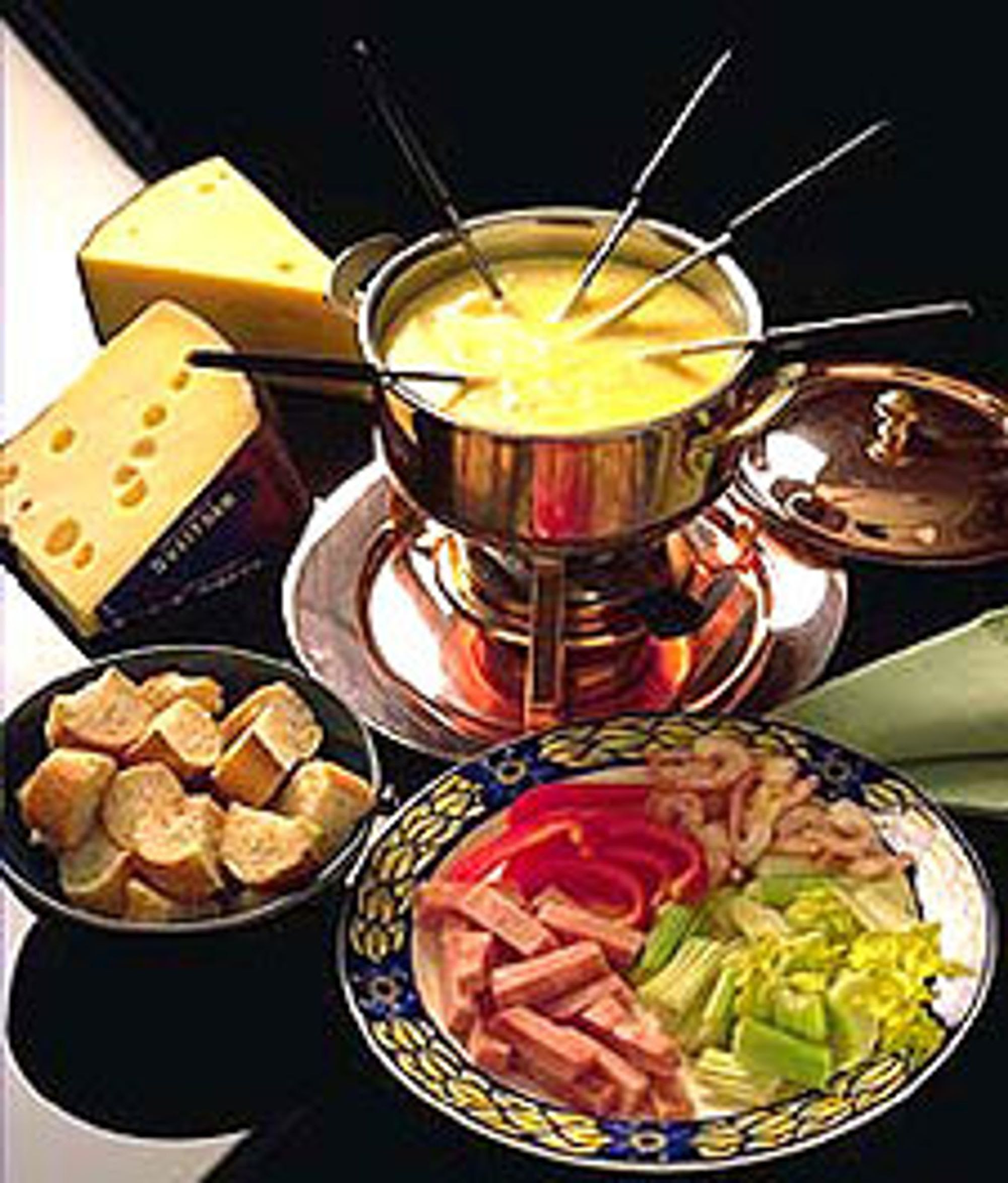 Bor i Sveits, selveste ostefondue landet. Vi pleier å servere fondue med tørket oksekjøtt fra Graubunden, Bressaola er det som ligner mest . Varm opp blandingen og skjær opp tilbehør og maten er klar. Her får du flere oppskrifter på.